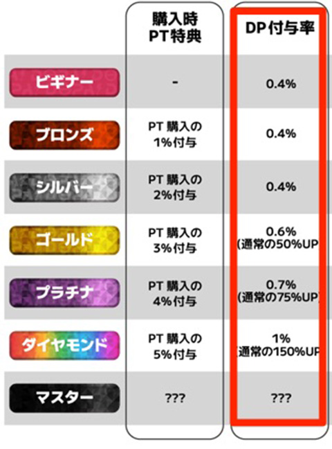 しかし、ポイントを購入した際に付与されるDPの付与率は『0.4%』となっていますので、一番下のランクでもお得にポイントを購入できます。