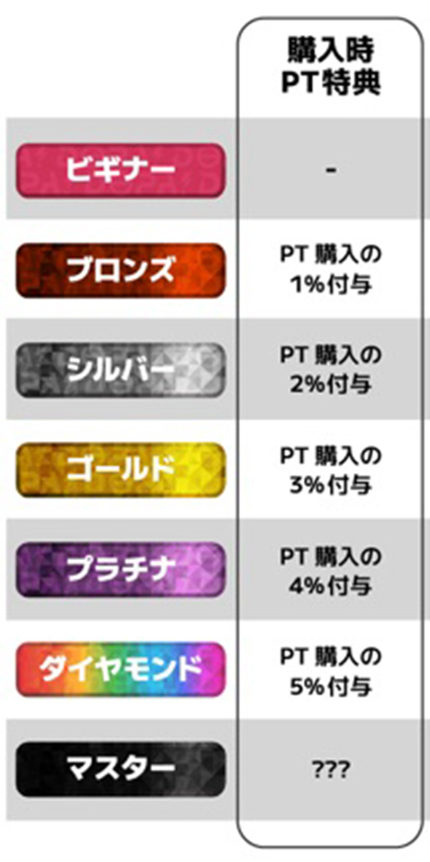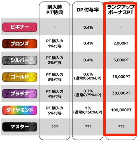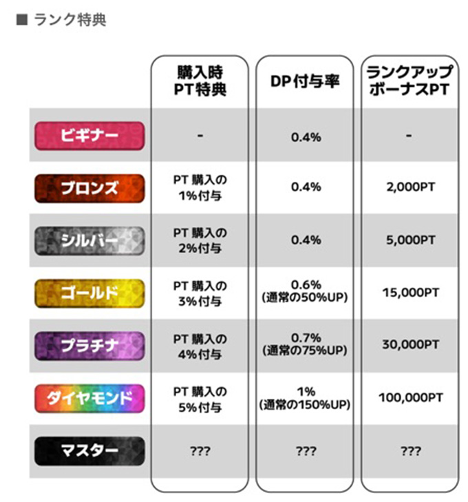 ポイントを購入した際のポイントそのものの付与率と、DP付与率はランクごとに異なり、さらにランクアップ時にもらえるボーナスにも差が。