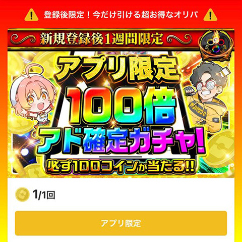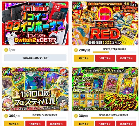 初回限定ガチャやログボは1コインで回せるのでオリパは当たりにくいものの、還元率はかなり高めなので必ず引いてください!