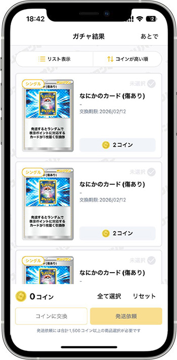 | 結果 | コイン交換専用カード 100コイン | コイン交換専用カード 1コイン |
