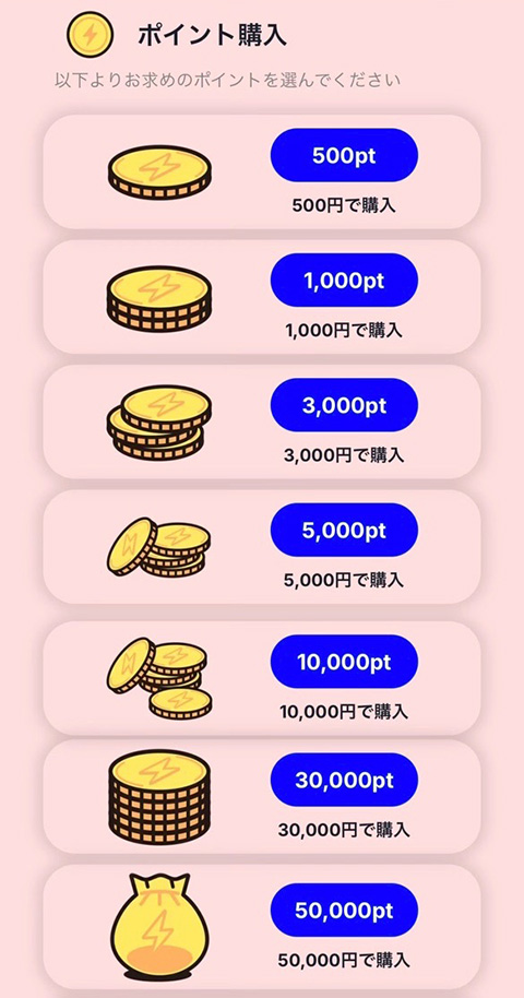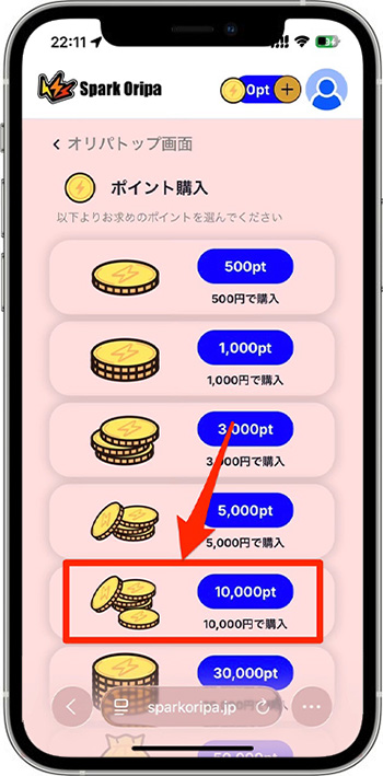 スパークオリパの料金は『1PT=1円』ですが、最低購入PT数は『500PTから』となっています。